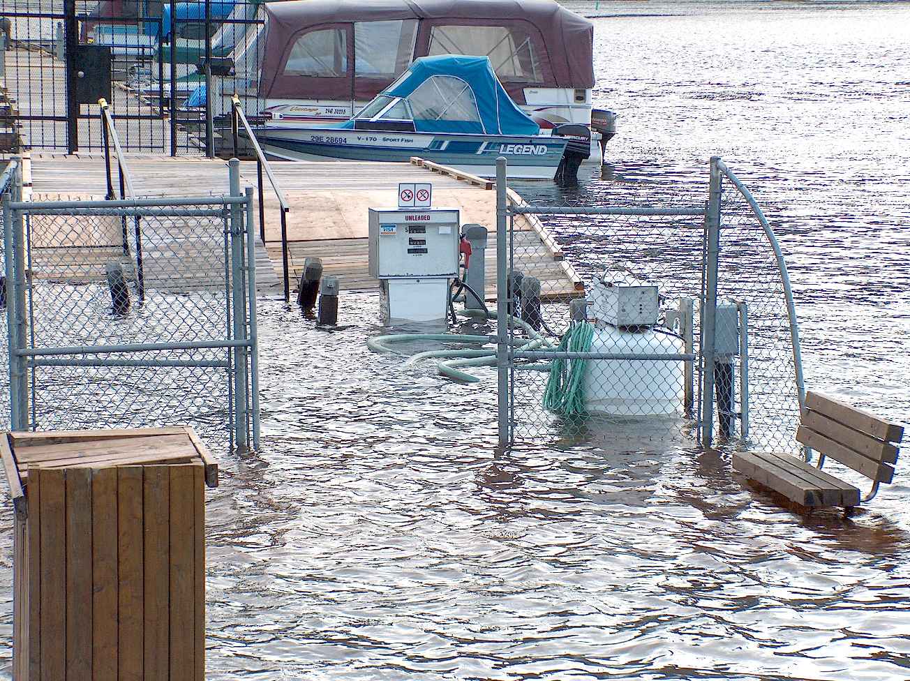 start of the 100k bike race....I don't want to say anything about the water in the Mattawa River being a bit high in 2004, but its a good thing that the gas jockeys had hip waders! |
